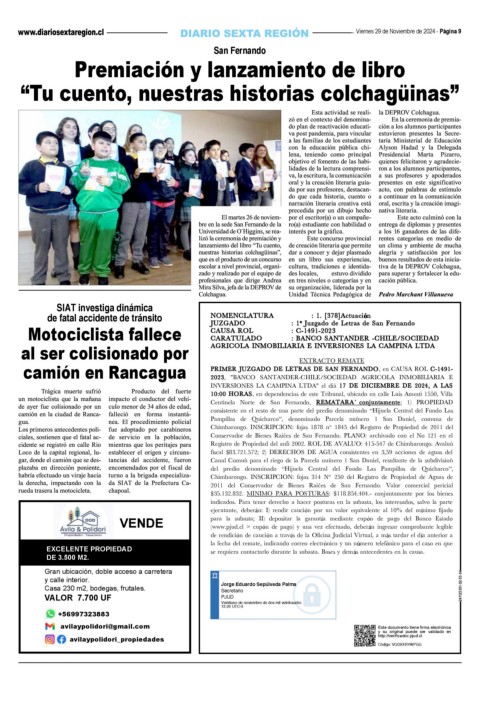 Motociclista fallece Centinela Norte de San Fernando, R REMATARA E : : C-1491-2023 N u T t A m e D t E R - C H I L E / S O C I E D A D
