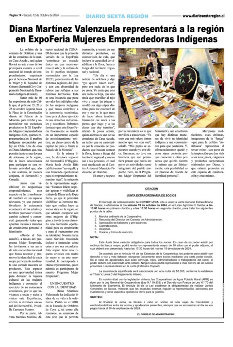 Página 14 - Sábado 12 de Octubre de 2024 Diana Martínez Valenzuela representará a la región en ExpoFeria Mujeres Emprendedoras Indígenas 10-12-15-241010501-02-03