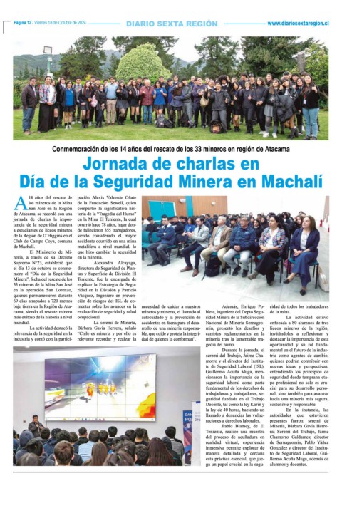 Página 12 - Viernes 18 de Octubre de 2024 www.diariosextaregion.cl Página 12 - Viernes 18 de Octubre de 2024 Conmemoración de los 14 años del rescate de los 33 mineros en región de Atacama Jornada de charlas en Día de la Seguridad Minera en Machalí