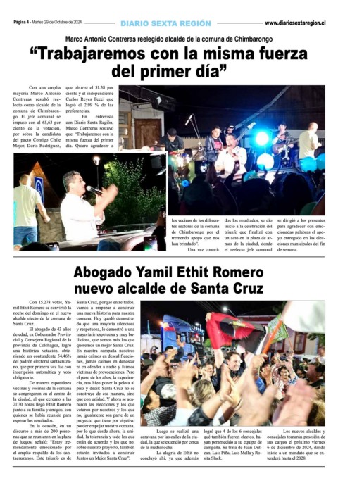 Página 4 - Martes 29 de Octubre de 2024 Marco Antonio Contreras reelegido alcalde de la comuna de Chimbarongo “Trabajaremos con la misma fuerza del primer día” Abogado Yamil Ethit Romero nuevo alcalde de Santa Cruz