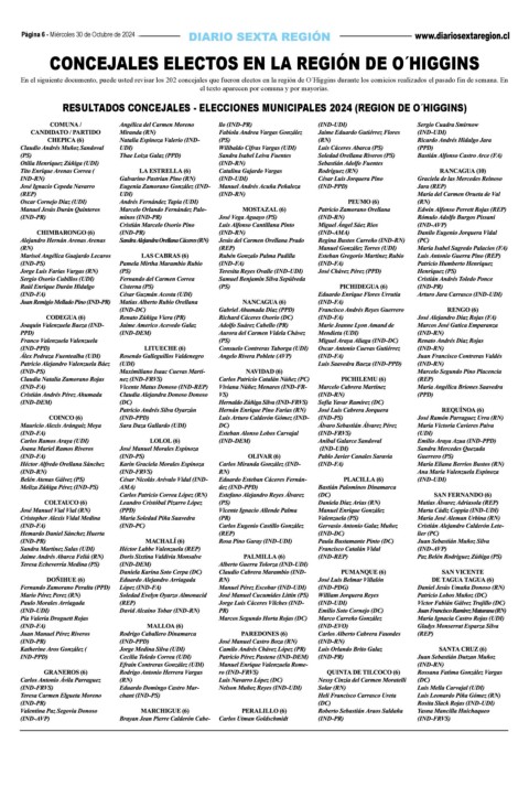 En el siguiente documento, puede usted revisar los 202 concejales que fueron electos en la región de O´Higgins durante los comicios realizados el pasado fin de semana. En