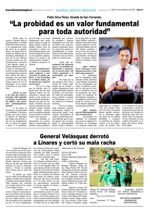 Martes 3 de Septiembre de 2024 - Página 5 Pablo Silva Pérez, Alcalde de San Fernando: “La probidad es un valor fundamental para toda autoridad” General Velásquez derrotó a Linares y cortó su mala racha