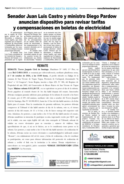 Tagua. M M nimo subasta 8.011,88 UFí í n i m l o 7 s u d e a s t o a c t 8 u . 0 1 e 1 , 8 8 e U F., en su equivalente en pesos al d a de la subasta.