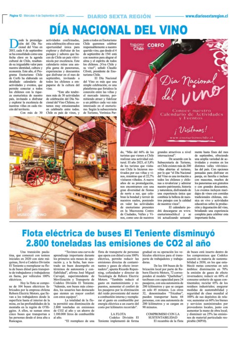 Página 12 - Miércoles 4 de Septiembre de 2024 www.diariosextaregion.cl Página 12 - Miércoles 4 de Septiembre de 2024 DÍA NACIONAL DEL VINO Flota eléctrica de buses El Teniente disminuyó 2.800 toneladas las emisiones de CO2 al año