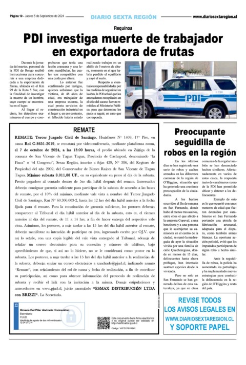 Tagua. M M nimo subasta 8.011,88 UFí í n i m l o 7 s u d b e a s t o a c t 8 u . b 1 e 1 , 8 d 8 e U F., en su equivalente en pesos al d a de la subasta. robos en la región