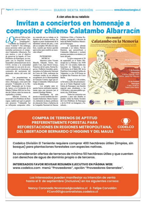 Página 12 - Jueves 5 de Septiembre de 2024 www.diariosextaregion.cl Página 12 - Jueves 5 de Septiembre de 2024 A cien años de su natalicio Invitan a conciertos en homenaje a compositor chileno Calatambo Albarracín