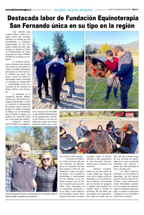 Jueves 5 de Septiembre de 2024 - Página 3 Destacada labor de Fundación Equinoterapia San Fernando única en su tipo en la región Hernán Oyanguren Guerrero, administrador de la fundación y Miriam Poblete Zapata, fundadora de la fundación.