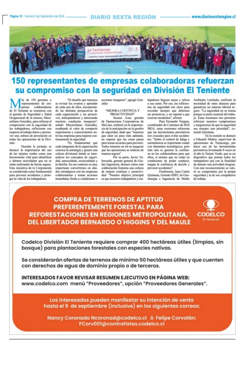 Página 12 - Viernes 6 de Septiembre de 2024 www.diariosextaregion.cl Página 12 - Viernes 6 de Septiembre de 2024 150 representantes de empresas colaboradoras refuerzan su compromiso con la seguridad en División El Teniente