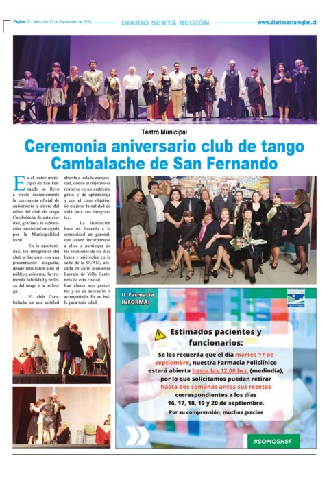 Página 12 - Miércoles 11 de Septiembre de 2024 www.diariosextaregion.cl Página 12 - Miércoles 11 de Septiembre de 2024 Teatro Municipal Ceremonia aniversario club de tango Cambalache de San Fernando