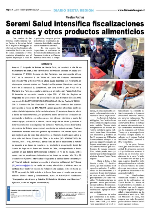 Ante el 1º Juzgado de Letras de Santa Cruz, se rematará el día 24 de