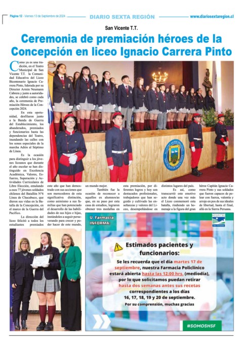 Página 12 - Viernes 13 de Septiembre de 2024 www.diariosextaregion.cl Página 12 - Viernes 13 de Septiembre de 2024 San Vicente T.T. Ceremonia de premiación héroes de la Concepción en liceo Ignacio Carrera Pinto