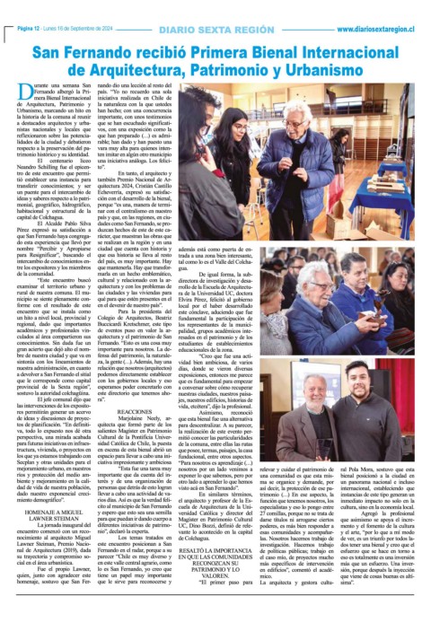 Página 12 - Lunes 16 de Septiembre de 2024 www.diariosextaregion.cl Página 12 - Lunes 16 de Septiembre de 2024 San Fernando recibió Primera Bienal Internacional de Arquitectura, Patrimonio y Urbanismo