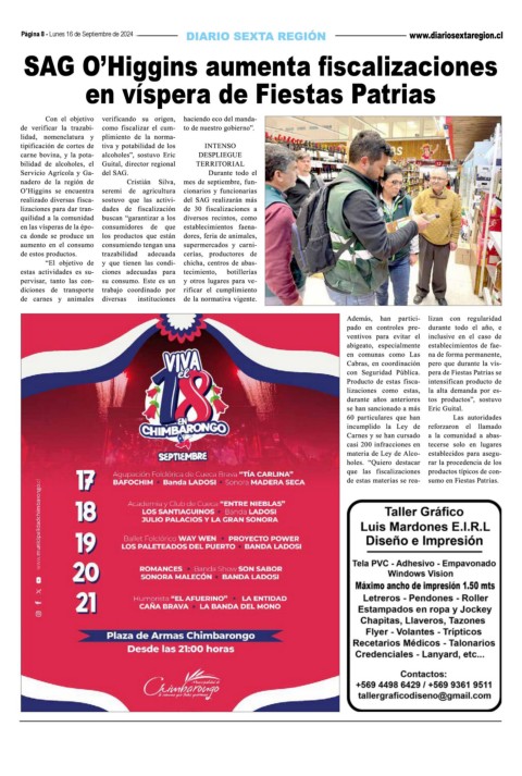 Página 8 - Lunes 16 de Septiembre de 2024 SAG O’Higgins aumenta fiscalizaciones en víspera de Fiestas Patrias
