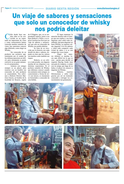 Página 12 - Viernes 27 de Septiembre de 2024 www.diariosextaregion.cl Página 12 - Viernes 27 de Septiembre de 2024 Un viaje de sabores y sensaciones que solo un conocedor de whisky nos podría deleitar
