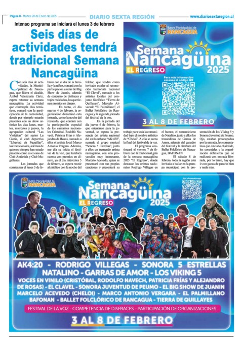 Página 8 - Martes 28 de Enero de 2025 www.diariosextaregion.cl Página 8 - Martes 28 de Enero de 2025 Intenso programa se iniciará el lunes 3 de febrero Seis días de actividades tendrá tradicional Semana Nancagüina