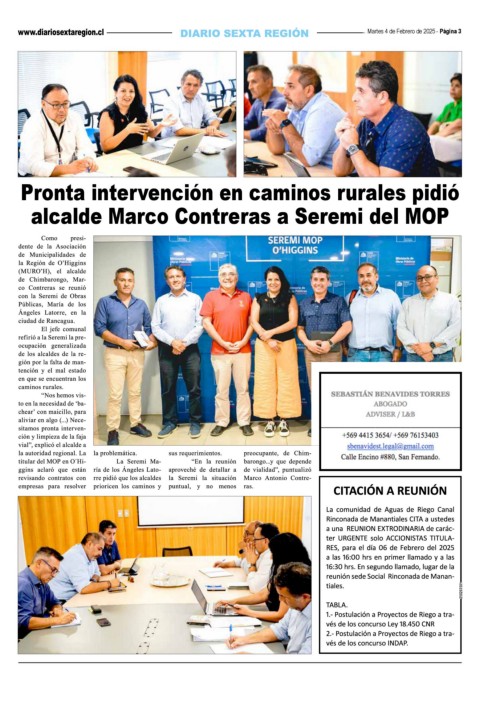 Martes 4 de Febrero de 2025 - Página 3 Pronta intervención en caminos rurales pidió alcalde Marco Contreras a Seremi del MOP 250203501