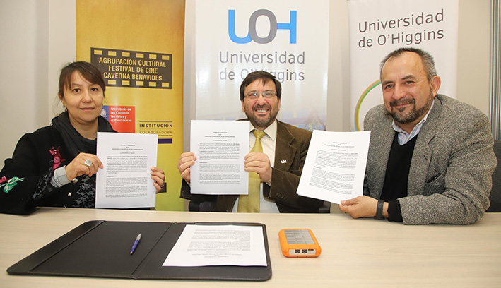 El acuerdo se realizó en el Campus Rancagua de la Universidad de O'Higgins, con la participación del Rector (s) de la Universidad de O'Higgins, Marcello Visconti, el coordinador académico del IEA, Ricardo Carrasco y la directora del Festival Internacional de Cine de Lebu, Claudia Pino.
