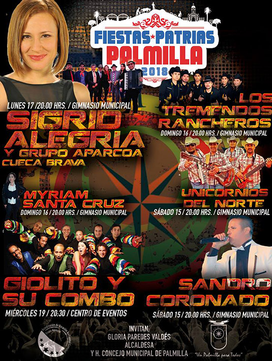 Para el día lunes 17 de septiembre a las 17 horas, está contemplada la gran final del cuadrangular de fútbol Seniors Fiestas Patrias Palmilla 2018 y a las 20 horas una gran invitada, Sigrid Alegría y el Grupo Aparcoa, llenaran de cueca brava nuestros aires dieciocheros, también con entrada liberada.
