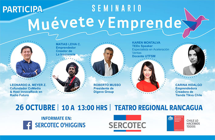 Conocer experiencias exitosas, adquirir herramientas para mejorar el miedo al fracaso y desarrollar ideas para concretar un negocio, son algunos de los ítems que considera el seminario "Muévete y Emprende", que el próximo viernes 26 de octubre, realizará Sercotec en el Teatro Regional de Rancagua, entre las 10.00 y las 13.00 horas.
