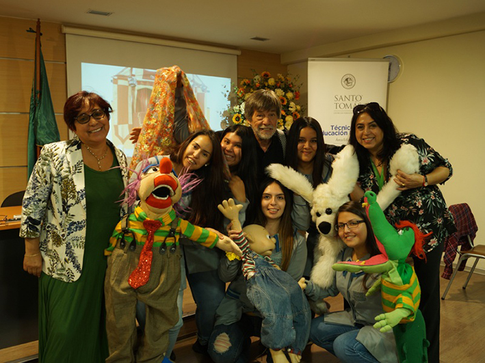 El "artista educador", como se define Olmos, compartió estos proyectos con estudiantes de Técnico en Educación Especial y Técnico en Educación Parvularia de Santo Tomás, en el marco del Día Mundial del Títere, que se conmemoró el pasado 21 de marzo. En el conversatorio reconoció sentirse "anonadado" con el trabajo con niños en colegios: "Ellos creen que yo vengo a jugar y lo dejamos así. Se trabaja con un profesor dupla, vemos las necesidades y armamos un conjunto de ideas. El promedio del SIMCE subió más de un 20% en los cursos que trabajamos", aseguró.
