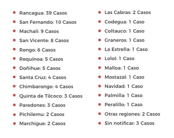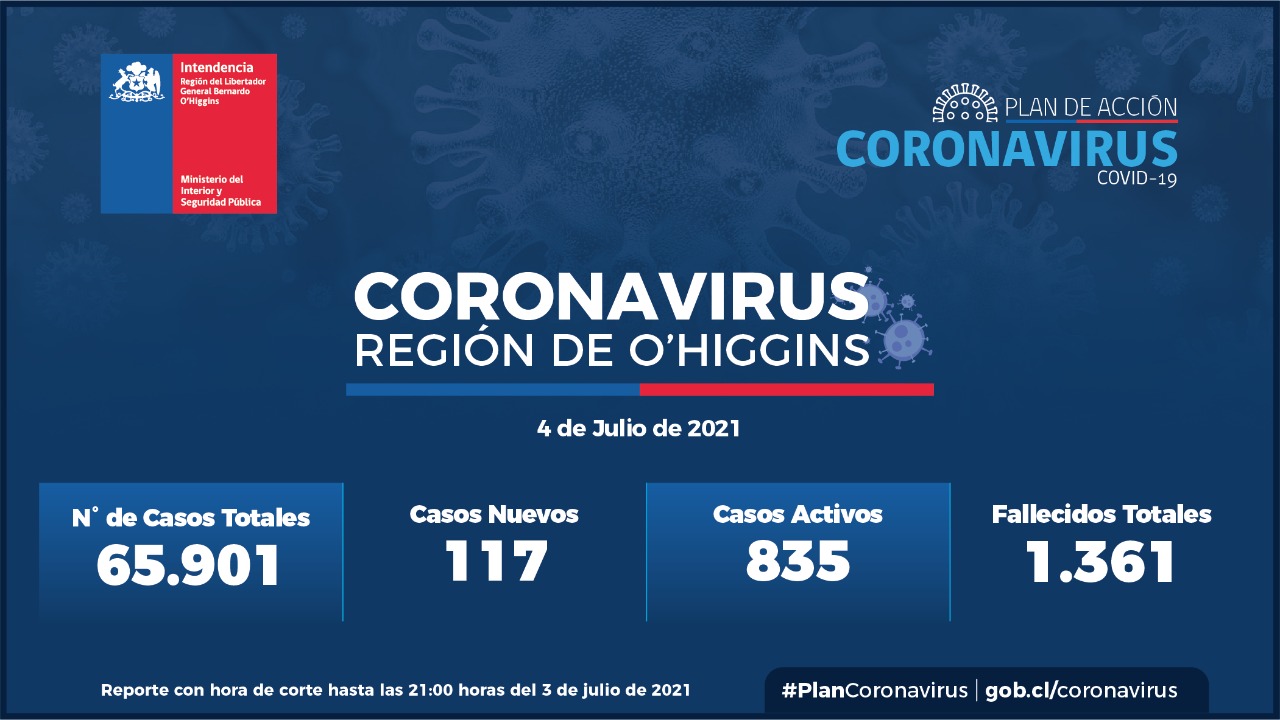 Hoy domingo, la región de O’Higgins registró 117 casos nuevos por Covid-19 en las últimas 24 horas, totalizando 65.901 contagiados a la fecha desde el inicio de la pandemia. A su vez, la cifra de fallecidos es de 1.361, debido a ocho decesos registrados en el informe. Los casos activos en la región son 835.