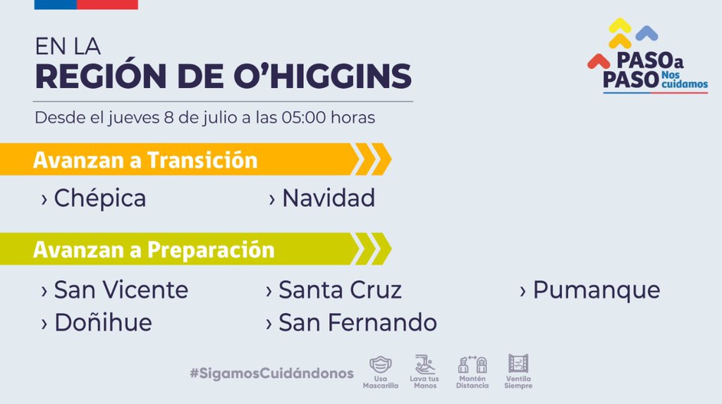 Las comunas de Doñihue, San Vicente, San Fernando, Santa Cruz y Paredones avanzan a Preparación (Fase 3), desde este jueves a las 05:00 horas. Mientras tanto las comunas de Chépica y Navidad salen de cuarentena para ingresar al Paso 2 (Transición) desde la misma fecha.