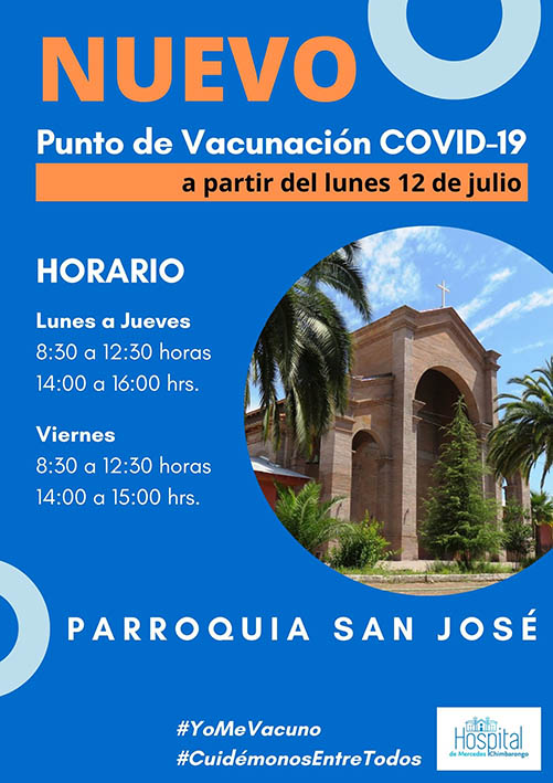 Hospital de Mercedes Chimbarongo informa a la comunidad, que a partir del próximo lunes 12 de julio, dispondrá de un nuevo Punto de Vacunación contra el COVID-19, el que estará ubicado en la Parroquia San José de avenida Miraflores. No necesitará agendar hora, será bajo el sistema de "demanda espontánea" hasta agotar el stock disponible diario.