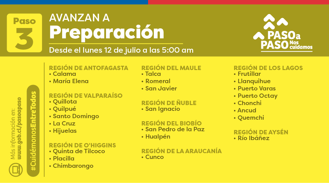El Minsal informó que las comunas de Chimbarongo, Placilla y Quinta de Tilcoco avanzan a Preparación (Fase 3), en el Plan Paso a Paso que impulsa el gobierno para frenar la pandemia que afecta al país, a contar del lunes 12 de julio a las 05:00 horas.
