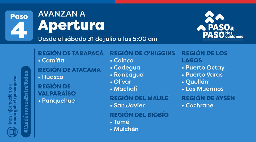 Las autoridades de salud informaron el día de hoy, que las comunas de Rancagua, Coinco, Codegua, Olivar y Machalí avanzan a la Fase 4 en el plan Paso a Paso que impulsa el gobierno en el control de la pandemia que afecta al país. Estos cambios se darán a partir de este sábado, a las cinco de la madrugada.