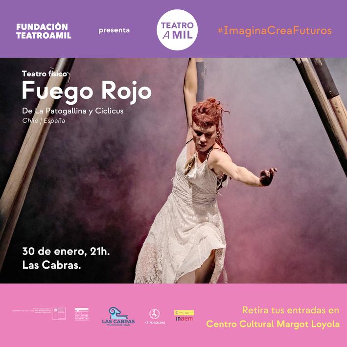 El domingo 30 de enero a las 21:00 horas, la Plaza de Armas de Las Cabras será el escenario de presentación de la obra "Fuego Rojo" de Teatro a Mil, interpretada por la compañía chilena la Patogallina junto a la catalana Cíclicus, quienes exhibirán por primera vez en la comuna y alrededores este reconocido montaje.
