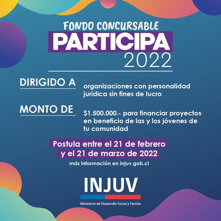 El Instituto Nacional de la Juventud (INJUV) inició el lunes recién pasado las postulaciones para acceder al Fondo Participa 2022, un financiamiento concursable al que pueden postular juntas de vecinos y organizaciones comunitarias, territoriales o funcionales que se encuentren constituidas como personas jurídicas sin fines de lucro.