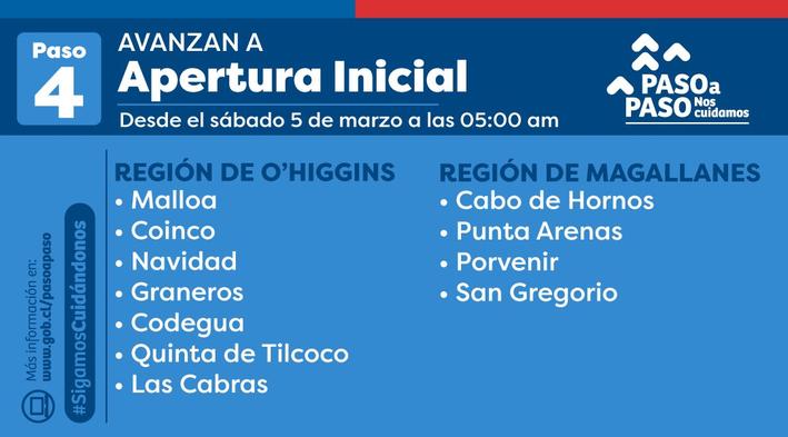 Ayer jueves, las autoridades sanitarias informaron que siete comunas de la región de O´Higgins tendrán modificaciones en el plan “Paso a Paso”, esto significa que las comunas de Malloa, Coinco, Navidad, Graneros, Codegua, Quinta de Tilcoco y Las Cabras avanzarán a la fase de Apertura Inicial (Paso 4) a partir de las cinco de la madrugada de mañana sábado.