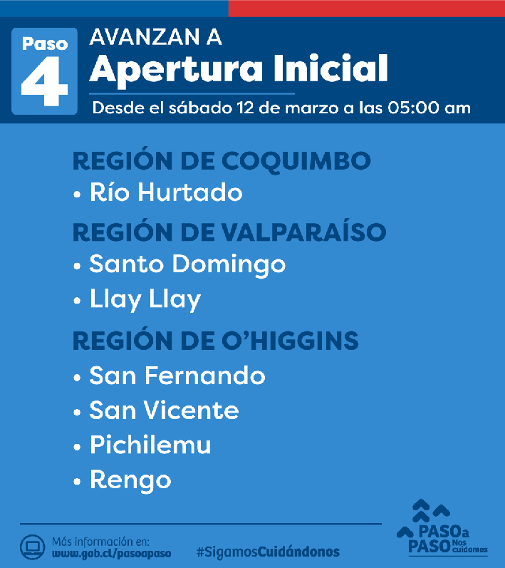 Las autoridades sanitarias informaron durante la mañana de hoy jueves, que cuatro comunas de la región de O´Higgins avanzarán en el plan “Paso a Paso” que se implementó para el control de pandemia en el país, estas modificaciones entrarán en vigencia a partir de este sábado a las cinco de la madrugada, en el cual incluirán a las comunas de San Fernando, San Vicente de Tagua-Tagua, Pichilemu y Rengo.