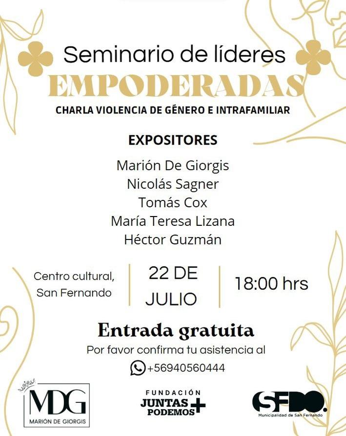 “Un interesante y nuevo seminario para líderes. Tema central: violencia de género e intrafamiliar. Grave realidad en miles de hogares y lugares de trabajo en Chile. Estaremos junto al destacado terapeuta holístico. Héctor Guzmán Alburquerque. Todas invitadas con cariño y respeto como siempre”, señala el productor de eventos, comunicador de radios y televisión y conferencista nacional, Tomás Cox.
