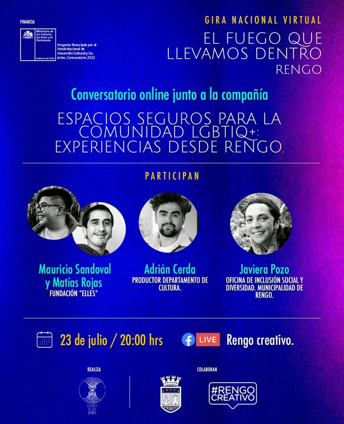 Y el sábado 23 a las 20.00 horas, se realizará el conversatorio "Espacios seguros para la comunidad LGBTIQ+: Experiencias desde Rengo", el cual se transmitirá en vivo por el Fanpage de Rengo Creativo: @rengocreativo.