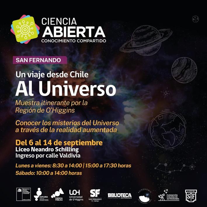 Enmarcado en su recorrido por la Región de O'Higgins, en el Liceo Neandro Schilling de San Fernando se instalará durante las primeras semanas de septiembre la muestra astronómica “Un viaje desde Chile al Universo”.
