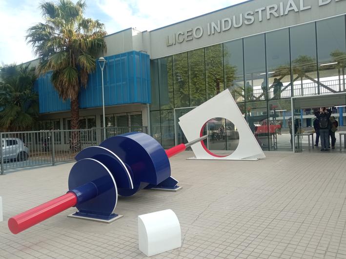 El martes de esta semana, fue inaugurada en el frontis del Liceo Industrial de San Fernando, la escultura moderna hecha en metal pintado, la que se titula “Precisión”, hecha por el artista Eduardo Ale Delgado y que en su placa adjunta de presentación y descripción al público dice literalmente “Las formas del conjunto escultórico evocan a herramientas mecánicas industriales mediante la proyección de un eje central que pasa visualmente por el centro de un volumen plano vertical, que a su vez corresponde en su mayor volumen al diámetro del corte circular del cuadrado”.