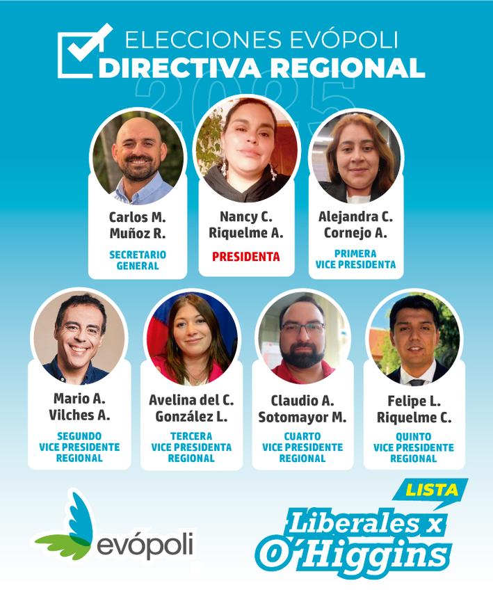 Esta lista regional está comprometida con el apoyo a la reelección de Gloria Hutt para presidenta nacional con la lista Mérito, valor que impulsan como partido de centro derecha liberal. Gloria Hutt ha realizado una gran gestión junto a la directiva actual, la cual se renueva incorporando a las regiones en su directiva, como es el caso del actual presidente regional de Evopoli en O´Higgins Sebastián Pizarro de Machalí, profesional, que cursa Magister en Políticas Públicas y excandidato a concejal de esa comuna de la región de O´Higgins.