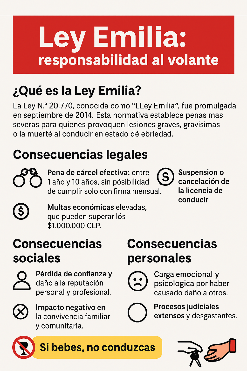 La Ley N.º 20.770, conocida como Ley Emilia, fue promulgada en septiembre de 2014. Esta normativa establece penas más severas para quienes provoquen lesiones graves, gravísimas o la muerte al conducir en estado de ebriedad.