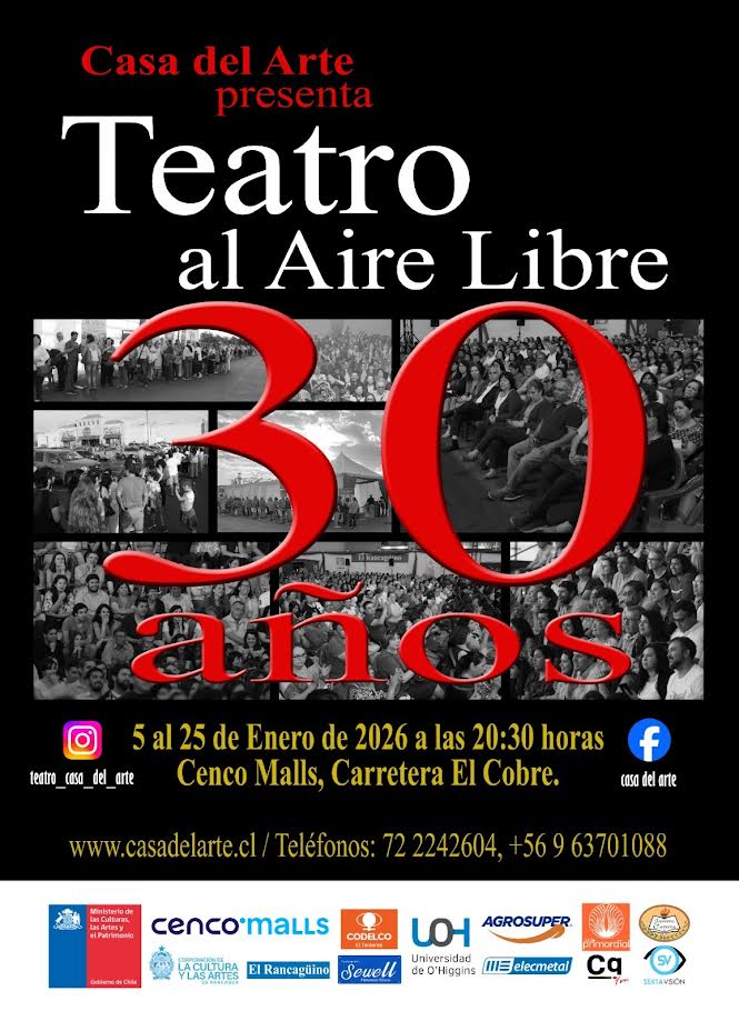 Teatro Casa del Arte, en colaboración con la Corporación de la Cultura y las Artes de la Ilustre Municipalidad de Rancagua, anuncian el regreso a Rancagua del Festival de Teatro al Aire Libre, en su versión número 30. La actividad se llevará a cabo entre los días 5 y 25 de enero de 2026, a las 20:30 horas, en la tradicional “carpa teatro” ubicada en el estacionamiento de Cenco Malls, ex Portal Rancagua.