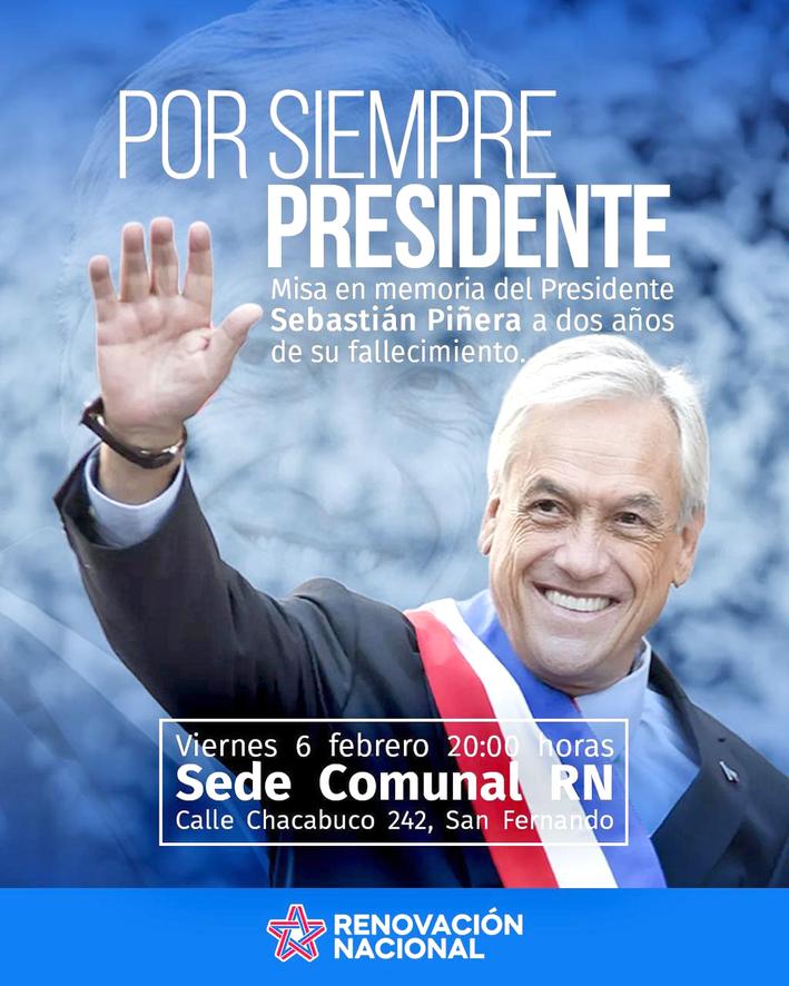 Al cumplirse el segundo aniversario del fallecimiento del ex Presidente de la República, Sebastián Piñera Echenique, la directiva comunal San Fernando de Renovación Nacional está invitando a la comunidad a participar de un responso que se oficiará en su memoria.