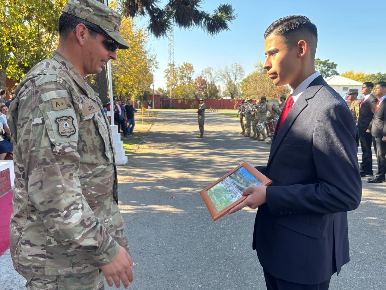 Además, el Soldado más antiguo de la promoción, en agradecimiento por la entrega de conocimientos, compromiso, dedicación durante estos dos años y el gran sentido de pertenencia hacia su Unidad, hizo entrega al Comandante del Regimiento de un obsequio que será expuesto en la galería del recuerdo, para las futuras promociones de soldados conscriptos.
