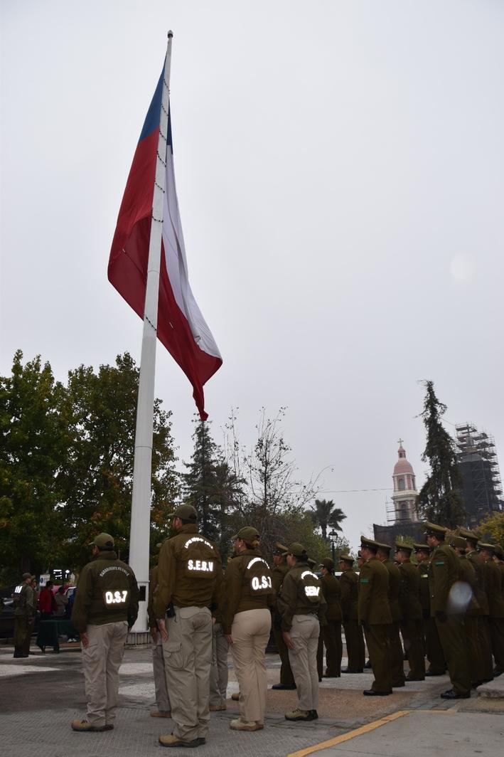 Con solemnidad y entonando el Himno Nacional, una delegación formada por Carabineros de las diferentes especialidades de la Región fueron izando la bandera de Chile a los sones de la banda instrumental del Ejercito de Chile en Colchagua.