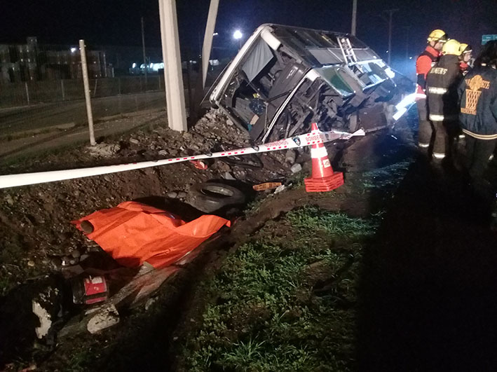 SAN FERNANDO; Un muerto y al menos 9 personas lesionadas de diversa consideración fue el resultado que dejó el volcamiento de un bus en la entrada norte a la comuna de San Fernando.