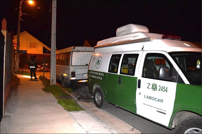 Peritos del Laboratorio de Criminalística de la Prefectura de Carabineros Cachapoal investigan las causas y dinámica de una confusa riña generada en la comuna de Chimbarongo, que finalizó con al menos cuatro personas lesionadas con arma blanca.