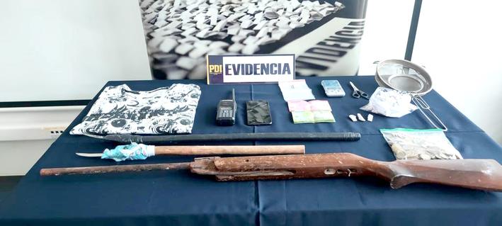 La PDI informó que, durante el procedimiento policial, también fueron encontrados elementos para pesar y dosificar droga, dos estoques, un rifle de aire comprimido y alrededor de 56 mil pesos en efectivo, dinero presumiblemente obtenido de la venta de droga.