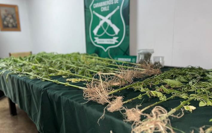 En la labor investigativa, se encontró en su residencia 12 plantas de marihuana de los cuales median entre un metro a 2.10 metros aproximadamente, además se encontraron 127 gramos, 200 miligramos de marihuana, el detenido es un hombre de 43 años de edad con antecedentes policiales por infracción a la Ley 20.000, amenazas simples y lesiones graves.