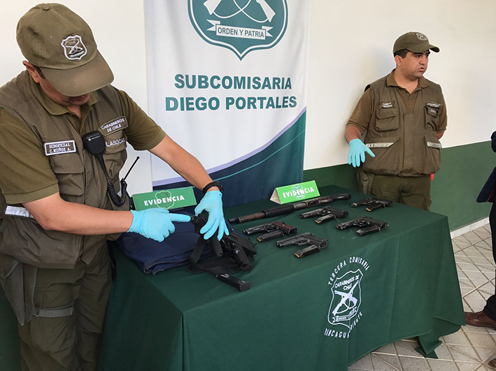 Al allanar sus domicilios en la población Diego Portales de la capital regional, carabineros detuvo a cinco de los delincuentes, entre ellos una mujer, todos con un nutrido prontuario policial, e incautó armamento de fuego corto y largo, chalecos antibalas, drogas y dos vehículos, uno de ellos con encargo vigente por robo.