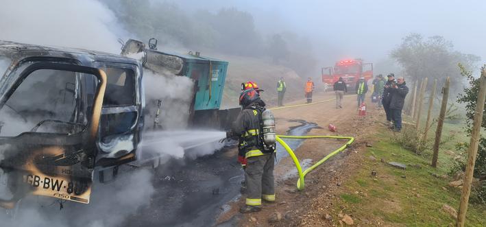 Totalmente quemado resultó un camión tres cuartos, que la mañana de ayer mientras transportaba un generador de electricidad por la Ruta I-45 que conduce a la zona precordillerana de San Fernando, fue afectado por un incendio a la altura del sector de La Rufina.