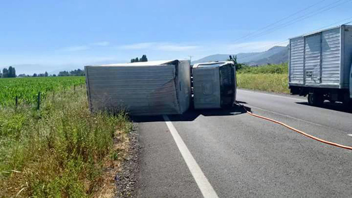 Por causas que están siendo investigadas por carabineros, el conductor del camión cargado con huevos, que se dirigía a San Fernando, perdió el control del pesado vehículo saliéndose de la pista de circulación terminando finalmente volcado a un costado de la carretera.